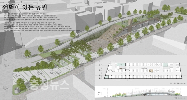 이번에 선정된 공모안은 오룡지하차도와 상부 주차장 사이 공간을 130여 대 차량을 위한 지하주차장으로 활용하고 상부는 기존 지형에 맞는 공원으로 조성해 입체화하도록 설계했다.