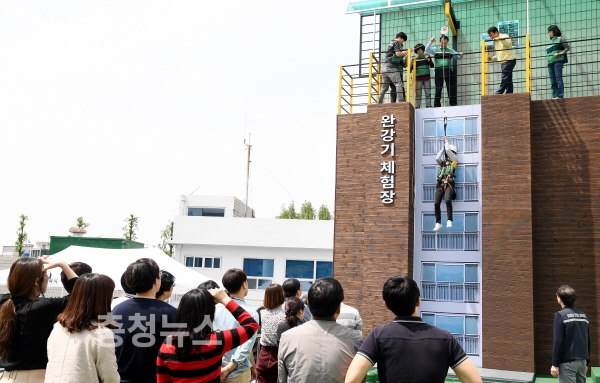 대전 중구(구청장 박용갑)가 완강기 체험장 설치를 완료하고 26일 첫 체험교육을 실시했다.