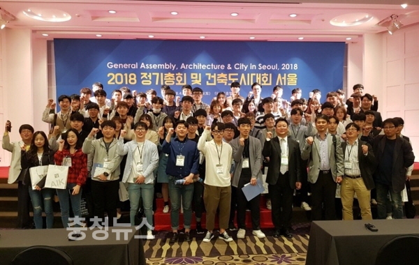 서울 더케이호텔 내 행사장에서 한밭대 건축공학과 수상자와 지도교수, 재학생들이 기념촬영을 하고 있다.