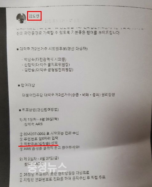 이날 두 예비후보는 대전시의회 기자실에서 “김도연 전 대덕구지역위 사무국장이 경선(26~27일)을 앞두고 지역권리당원 밴드에 특정 후보(김찬술) 지지를 독려하는 메시지 및 게시글을 올리는 등 불공정 경선 행위를 포착해 박종래 지역위원장과 김 전 사무국장을 검찰에 고소했다”고 밝혔다.