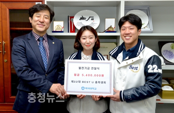 백석대학교(총장 장종현) 총학생회는 1일 교내 대학발전기금팀을 방문해 재학생을 위한 장학금 540만원을 기탁했다.