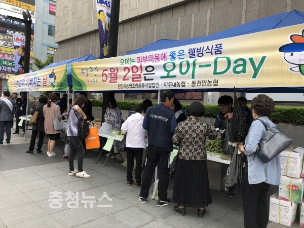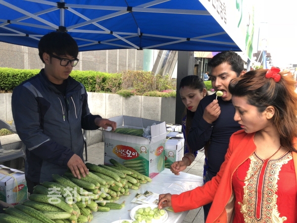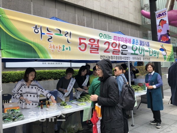 충남 천안시가 지역 대표 특화품목인 ‘오이’의 우수성을 홍보하기 위해 2일 아라리오 광장에서 ‘오이-데이(Cucumber Day) 행사’를 가졌다.