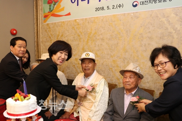 대전지방보훈청은 2일 어버이날을 맞아 연향한정식(대전 서구 둔산동 소재)에서 100세를 맞이하신 6‧25참전 국가유공자를 초청해 카네이션 달아드리기 및 위로연 행사를 열었다.