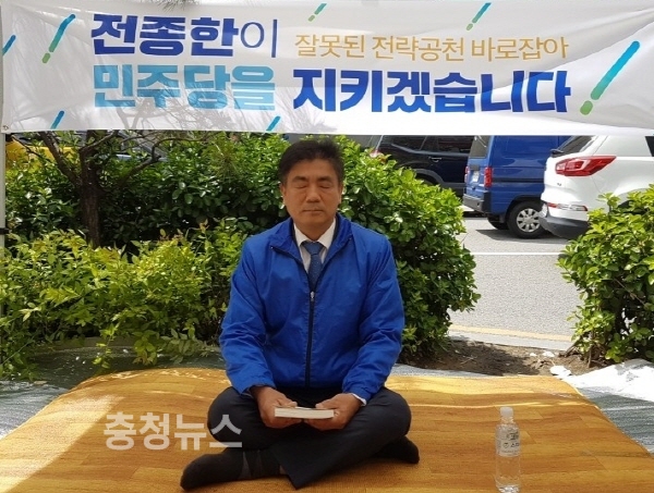 더불어민주당 전종한 천안시장 예비후보가 3일 민주당 충남도당 앞에서 당의 구본영 현 시장 전략공천에 반발해 무기한 천막 농성에 돌입했다.
