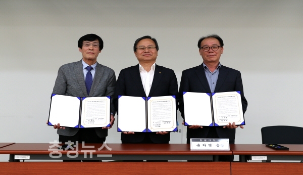 한밭대학교와 대전광역시립장애인복지관, 유성구자원봉사센터가 ‘지역사회와 함께 봉사하는 행복한 동행!’ 업무협약을 체결하고 송하영 총장(중앙)과 윤창노 관장(좌측), 신찬균 센터장(우측)이 기념촬영을 하고 있다