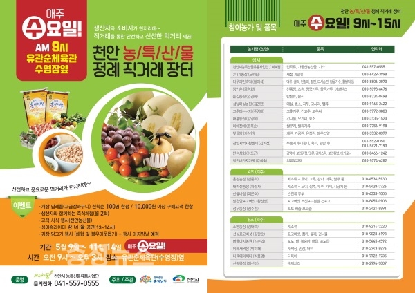 특히, 불량품과 수입산을 전면 배제하고 천안에서 생산된 농산물을 중심으로 친환경인증 농특산물을 판매하며 소비자와 함께하는 체험 프로그램, 이벤트, 할인행사도 진행한다.