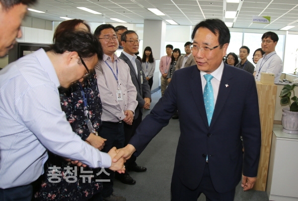 한현택 동구청장은 예비후보 등록을 앞둔 9일 동구청 각 부서를 찾아가 직원들과 일일이 악수를 하며 행정공백에 따른 업무누수가 발생하지 않을 것을 당부했다.