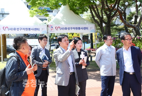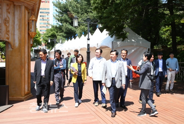이원구 유성구청장 권한대행이 ‘2018유성온천축제’를 앞두고 9일 축제 현장인 온천로 일원을 직접 찾아가 현장점검 모습