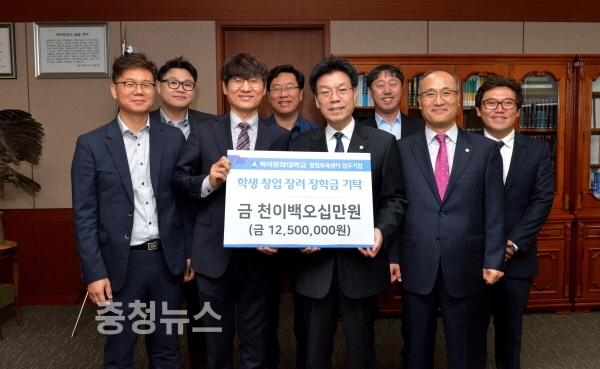 백석문화대학교 창업보육센터 입주기업들은 9일 교내 자유관 총괄부총장실에서 재학생들을 위한 창업 장려 장학금 1250만원을 기탁했다.