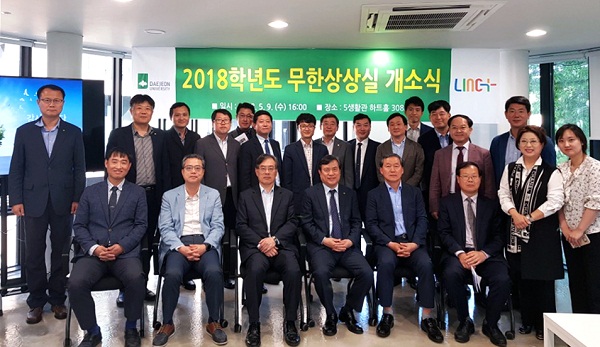 대전대 LINC+사업단은 9일 대학 HRC(HyeHwa Residential College) 하트홀에서 김선태 산학부총장 겸 LINC+사업단장을 비롯, HRC 이인철 학장, 대전경제통상진흥원 및 대전시 4차 산업혁명운영과 관계자 등 약 30여 명이 참석한 가운데 4차 산업혁명 대비 인프라 구축을 위한 ‘무한상상실’ 개소식을 가졌다.