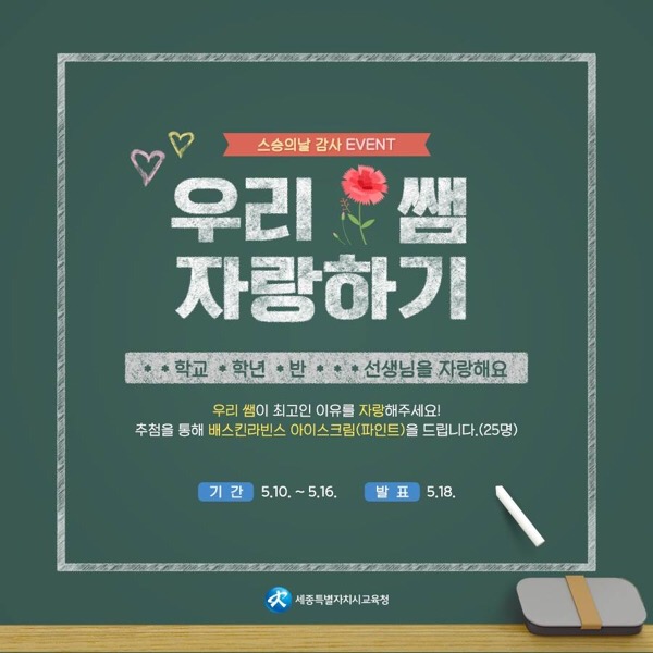 권순오 소통담당관은 “이번 이벤트로 선생님에 대한 사랑과 존경심을 담은 사연이 오늘도 학교 현장에서 노력하고 있는 사연의 주인공들에게 오롯이 전해지길 바란다”며, “세종시 학생들의 적극적인 참여를 바란다”고 말했다.