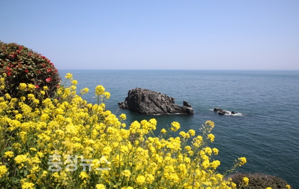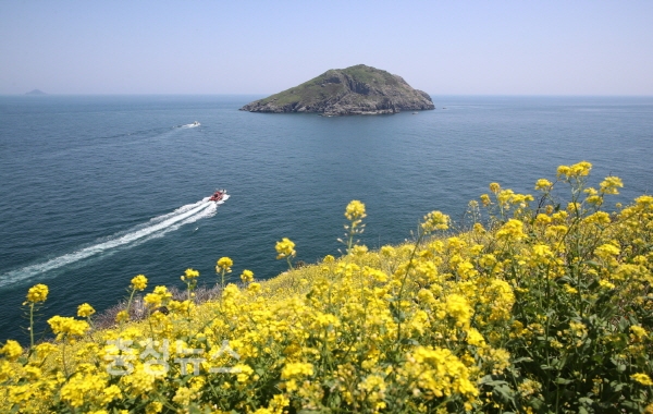 북 격렬비열도에 피어난 유채꽃 너머로 동 격렬비열도가 보인다.