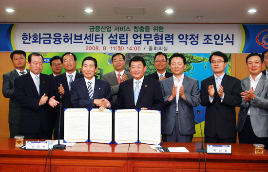 이날 협약식에서 박성효 시장은 “금융기능이 원활해야 산업이 살아날 수 있다”며 “대전은 돈을 만지고 돌리는 기능이 미흡했는데 한화금융허브센터의 입지는 그 의미가 대단히 크다”고 환영의 뜻을 전했다.