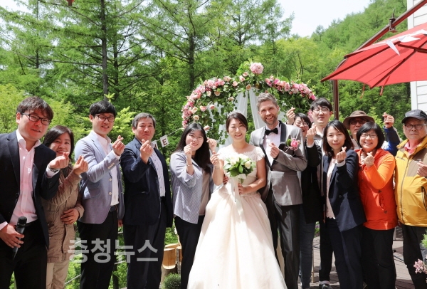 15일 강원도 횡성군 둔내면 국립횡성숲체원(원장 장관웅)에서 하객 30여 명이 참석한 가운데 네덜란드에 입양된 멜라니(34, 우측) 씨부부가 '숲속 아름다운 결혼식'을 치른 뒤 국립횡성숲체원 임직원들과기념촬영