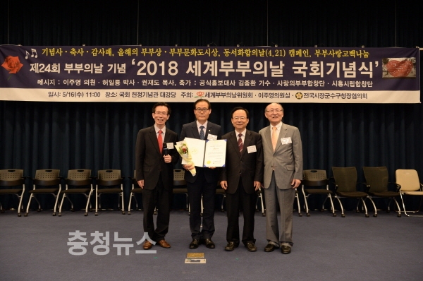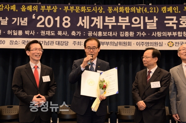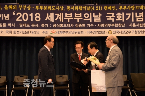 충남 공주시가 16일 국회헌정기념관 대강당에서 열린 2018 세계부부의 날 국회기념식에서 ‘2018 올해의 부부문화 도시상’을 받는 영예를 안았다.