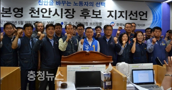 한국노총 충남세종본부 천안지역지부는 18일 천안시청 브리핑실에서 더불어민주당 구본영 천안시장 후보의 지지를 선언했다.