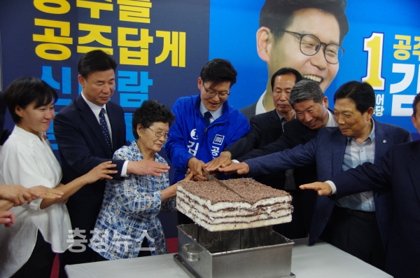 더불어민주당 김정섭 공주시장 후보가 19일 선거사무소 개소식을 열고 세과시에 나서며 필승을 다짐했다.