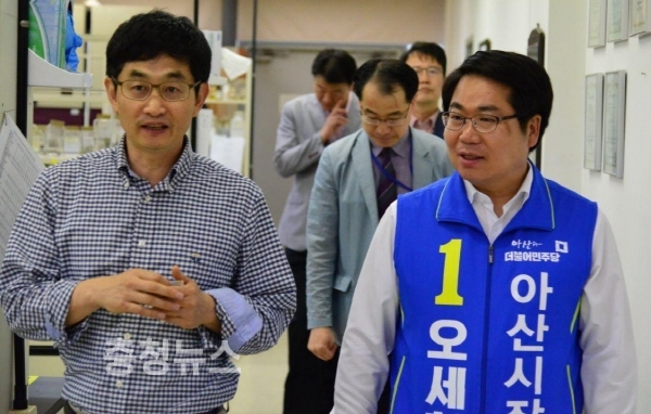 송 센터장의 설명에 오세현 후보는 “의약바이오산업 연구 분야에서 경쟁력을 갖추고 있는 순천향대학교가 앞으로도 아산시와의 지속적인 협력을 통해 온천을 활용한 의료 · 뷰티 · 관광 등 부가가치산업을 함께 추진해 나갈 수 있기를 바란다”고 화답했다.
