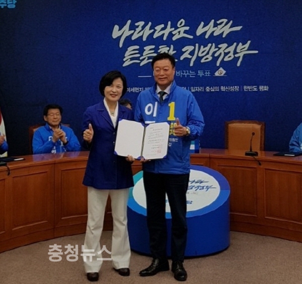 더불어민주당 이규희 천안갑 국회의원 예비후보는 21일 오전 서울 여의도 국회본청 당대표실에서 열린 6.13 국회의원 재보궐선거·지방선거 후보 공천장 수여식에서 추미애 당대표로부터 공천장을 받고 필승을 다짐했다.