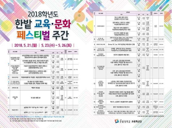 국립 한밭대학교(총장 송하영)는 21일부터 26일까지 ‘교육·문화 페스티벌 주간’을 운영한다고 밝혔다.