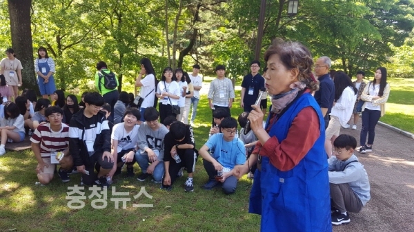 공주 무령왕릉에서 캠프에 참여한 학생들이 문화해설사 설명 듣는 모습