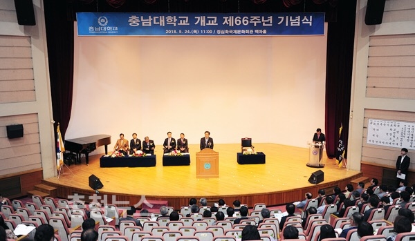 충남대는 24일 오전 11시, 정심화국제문화회관 백마홀에서 오덕성 총장, 강도묵 총동창회장 등 대내외 인사와 대학구성원이 참석한 가운데 개교 66주년 기념식을 개최했다.