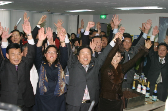 ▲ 열린우리당 대전시당 위원장 박병석 의원(서갑)과 당원들이 합헌결정에 만세를 부르며 환호하고 있다.