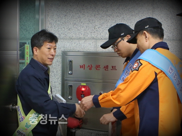 25일‘방재의 날’국무총리상을 받은 공사 최종환부장이 지난달 국민안전의 날 합동 안전행사에서 119대원에게 도시철도 역사 소화전을 설명하고 있다.