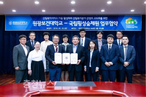 산림청 한국산림복지진흥원(원장 윤영균)은 소속기관인 국립횡성숲체원(원장 장관웅)이 25일 전북 익산시 원광보건대학교(총장 김인종)에서 이 대학과 ‘산림복지서비스 활성화 및 연구’를 위한 업무협약(MOU)을 체결했다고 밝혔다.