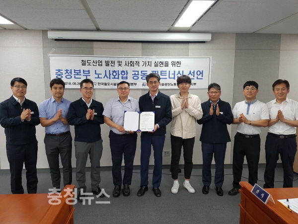 한국철도시설공단 충청본부(본부장 장봉희)는 28일 충청본부 상황실(대전시 동구 소재)에서 철도산업 발전과 근로조건 향상을 위한 노·사 공동 파트너십을 선언했다고 밝혔다.