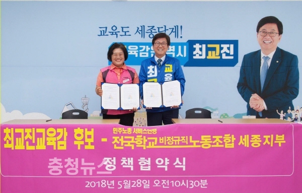 최교진 세종시교육감 후보와 전국학교비정규직노동조합 세종지부(지부장 이영희)가 오는 28일 선거캠프 사무소에서 학교비정규직 노동자들의 처우 개선과 정규직 전환을 위한 상호 정책협약을 맺었다.