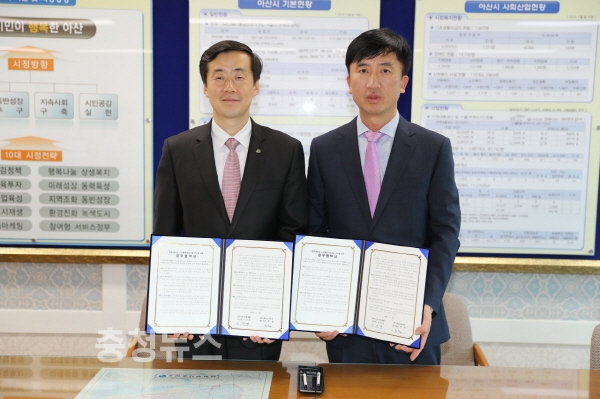 충남 아산시와 KT 충남고객본부(법인단장 류평, 이하‘KT’)가 지난 30일 아산시청 부시장실에서 ‘온양원도심 도시재생 뉴딜사업’의 성공적인 추진을 위한 업무협약을 체결했다.