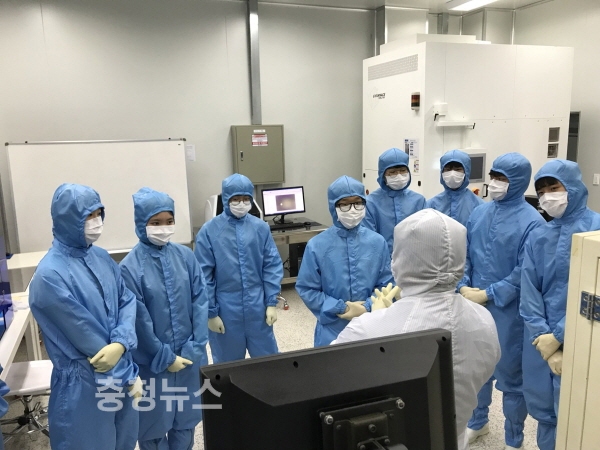 학생들은 반도체 클린룸에서 직접 방진복을 착용하고 반도체 공정과 다양한 공정장비 및 반도체 엔지니어로 수행해야 할 실무작업 등에 대해 설명을 들을 수 있었다.