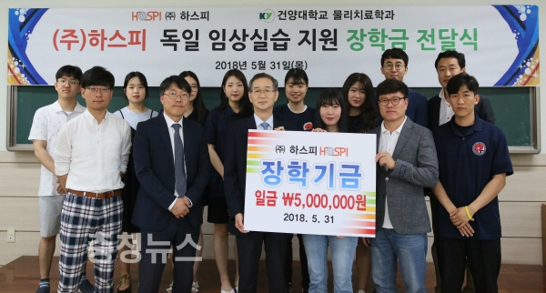 ㈜하스피 이준수 부사장은 “이 장학금을 통해 학생들이 해외임상실습에 조금이라도 더 배우고 경험해올 수 있다면 큰 보람이 될 것”이라고 밝히며 “건양대의 가족기업으로서 앞으로도 건양대 물리치료학과의 우수인재 육성을 위하여 지속적으로 함께 노력할 계획”이라고 말했다.