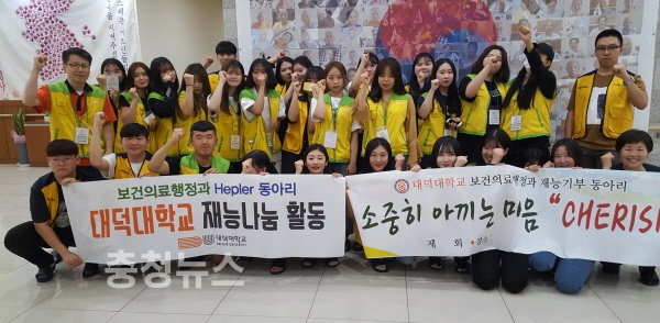 대덕대학교는 보건의료행정과 재능나눔동아리인 HELPER(회장 김한솔), CHERISH(회장 김호정) 학생들이 지난 2일 대전보훈요양원에서 재능나눔활동에 나섰다고 3일 밝혔다.