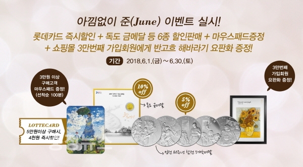 이번 이벤트에선 한국전쟁 참전 5개국(미국, 영국, 캐나다, 터키, 호주) 메달을 5%, 광복 70주년 독도 금메달은 10% 할인해 판매한다. 롯데카드로 5만원 이상 구매하는 고객에게 4000원 즉시할인 혜택도 준다.