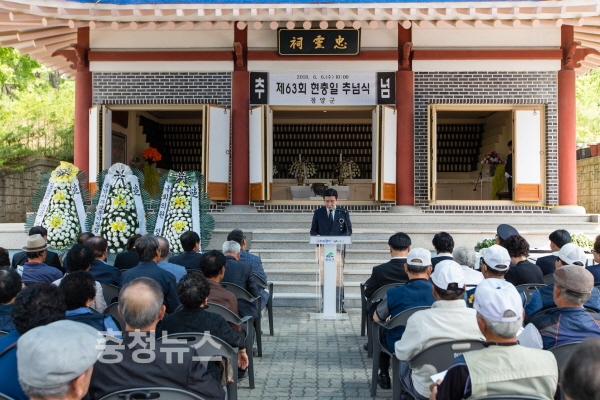 충남 청양군은 조국을 위해 헌신·희생하신 순국선열과 호국영령의 넋을 기리고자 6일 오전 청양읍 충령사에서 제63회 현충일 추념식을 거행하고 대치면에 위치한 충혼탑을 참배했다.