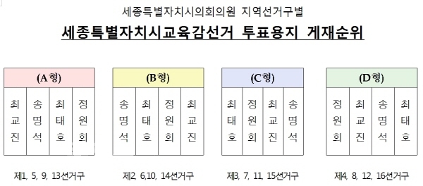 이에따라 투표용지에 교육감후보가 게재되는 순서는 A형, B형, C형, D형으로 나눠지며, 제1 지역 선거구 ~ 제16 지역선거구 세종시의회 의원 지역선거구마다 순환해 배치된다.