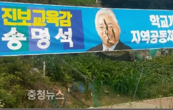 사건은 9일 자정 ~ 10일 아침 사이에 세종시 금남면 용포리 버스정류장 인근 도로변에 게시된 송명석 세종시교육감 후보 선거홍보 현수막이 누군가의 의도적 행위에 의해 심각하게 훼손되었다.