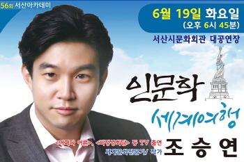충남 서산시가 오는 19일 시 문화회관 대공연장에서 베스트셀러 작가이자 세계문화전문가인 조승연 작가를 초청해 ‘인문학 세계여행’ 이라는 주제로‘제56회 서산아카데미’ 를 연다.