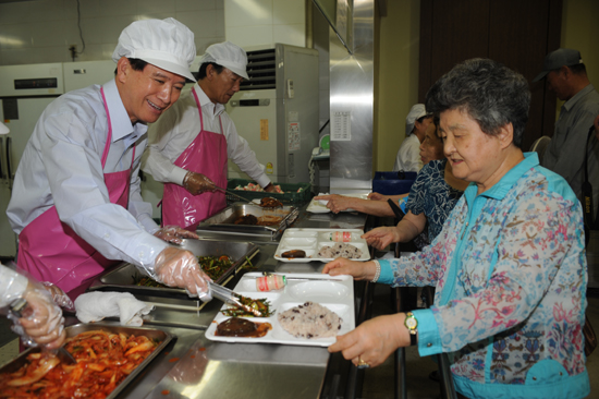 김형오 의장은 이날 복지관에서 어르신들께 직접 밥을 푸고 반찬을 담으며 배식을 도왔고, 배식 후에는 거동이 불편한 어르신들을 직접 찾아가 식사를 도우는 등 따뜻한 정을 나누는 시간을 가졌다.