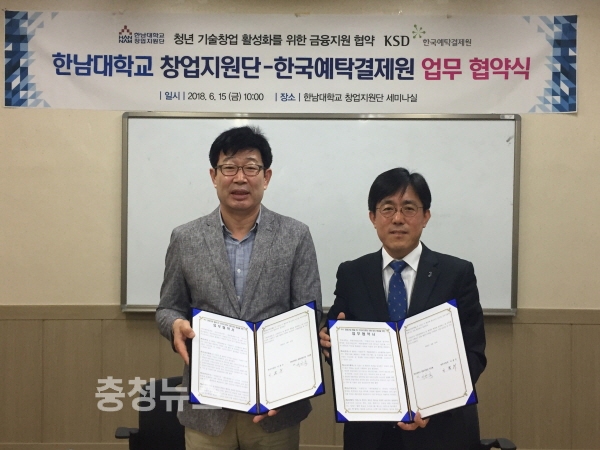 한남대(총장 이덕훈) 창업지원단은 15일 한국예탁결제원 대전지원(지원장 이종수)과 우수 창업기업 발굴 및 크라우드펀딩 지원 등을 위한 업무 협약을 체결했다.