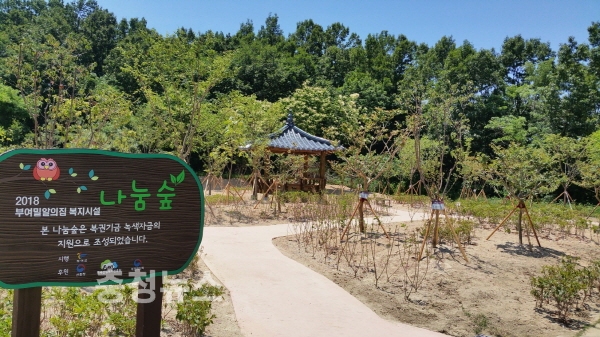 충남 부여군은 2018년도 복권위원회와 산림청 한국산림복지진흥원의 녹색자금 후원으로 사업비 1억1천만 원을 지원받아 부여군 장암면 정암리 285번지 일원 부여밀알의집 복지시설에 나눔숲을 선물했다.