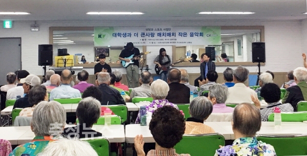 하지만 한 학기 동안 열심히 6곡의 노래를 연습했고, 그 결과 지난 14일 대학 근처 노인요양시설인 ‘더큰사랑요양원’의 ‘매치매치 주간노인보호시설’의 어르신들을 대상으로 작은 공연을 진행했다.