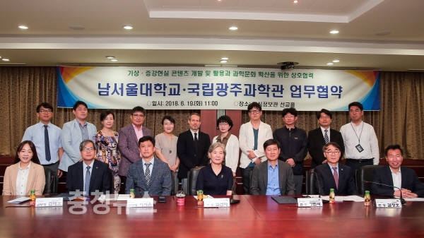 남서울대학교(총장 공정자)가 국립광주과학관(관장 김선아)과 19일 남서울대 지식정보관에서 가상증강현실 콘텐츠의 개발과 활용을 통해 과학문화를 확산하기 위한 상호 업무협약을 체결했다.