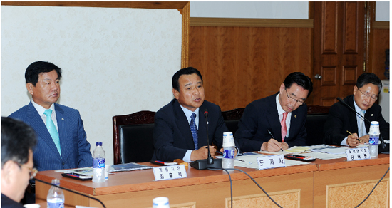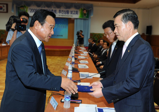 ▲ '2008계룡군(軍)문화축제 추진상황 보고회'(왼-최홍묵 계룡시장, 이완구지사,강태봉읭장,김동완부지사)