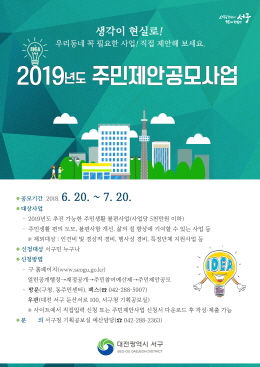 장종태 서구청장은 “주민들의 의견을 최대한 반영해 주민 제안 사업을 추진하겠다”라며, “주민제안 공모사업에 주민들의 많은 관심과 참여를 당부한다”고 말했다.