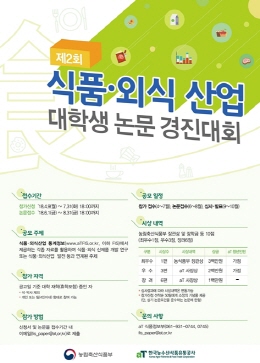 농림축산식품부와 한국농수산식품유통공사(aT, 사장 이병호)는 식품・외식산업에 관심 있는 젊은 재원들에게 식품・외식산업 정보를 활용한 논문발표 기회의 장을 제공하기 위해 전국 대학생 대상 「제2회 식품・외식산업 논문경진대회」를 개최한다.