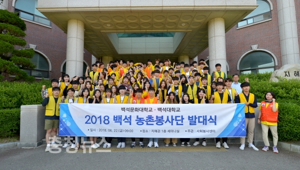 백석대학교(총장 장종현)ㆍ백석문화대학교 사회봉사센터는 22일 교내 지혜관 세미나실에서 ‘2018 백석 농촌봉사단 발대식’을 개최하고 본격적인 여름 농촌봉사활동에 나섰다.