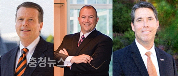 25일 한남대를 방문하는 APCU(미국장로교대학연맹) 총장들. 미국 웨인스버그대학 더글러스 리 총장, 부에나비스타대학 조슈아 머천트 총장, 파이크빌대학 버튼 웹 총장.(왼쪽부터)